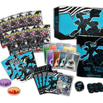 Caja de Entrenador Élite de Escarlata y Púrpura-Fulgor Negro o Escarlata y Púrpura-Llama Blanca (disponible el 18 de julio de 2025): Contiene nueve sobres de refuerzo de Escarlata y Púrpura-Fulgor Negro o Escarlata y Púrpura-Llama Blanca, según la caja; una carta promo de estilo Rara Ilustración de Thundurus o Tornadus, según la caja; y varios accesorios para jugar.
